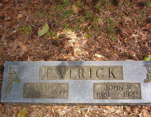 | Patrick | Sarah F. | 1860 | 1927 | s/s as John R. Patrick [FHR shows Sarah Frances, b: Jul 27 1861, d: Jan 10 1927, d/o Jack Shelton & Miss Bessent] View Tombstone |